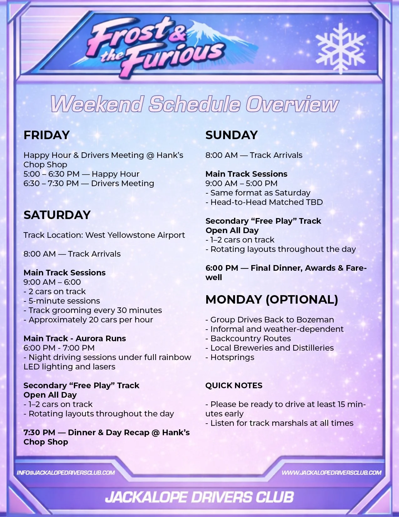 The Frost and the Furious is a grassroots winter motorsport weekend in West Yellowstone, built for drivers who want real seat time on a custom-groomed ice track. Expect capable cars, cold air, big slides, and a laid-back mountain-town atmosphere—no big teams, no haulers, just people who love to drive in winter.